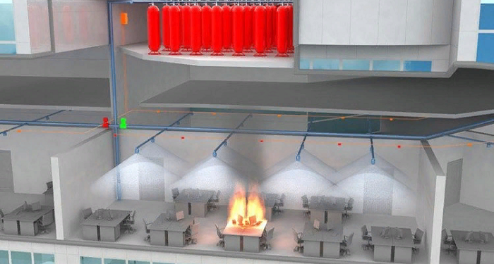 - Газовые. Применяются для объектов с ценным оборудованием и дорогостоящим имуществом. При срабатывании системы помещение заполняется специальным газом, лишая огонь кислорода, что позволяет эффективно тушить пожар.