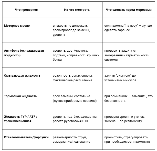 Короткое правило: если жидкость работает в мороз “на грани” (омыватель, антифриз, старое масло), лучше довести до нормы заранее, а не ждать первой ночи с минусом.